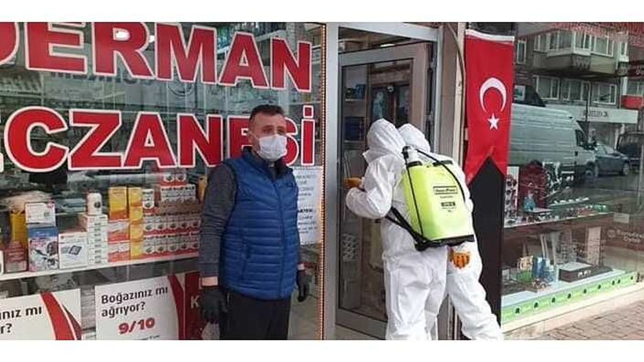 Ekipleri sabah saatlerinden itibaren Eczanelerde başlatmış olduğu dezenfektan çalışmalarına tüm ilçe genelinde aralıksız devam ediyor.