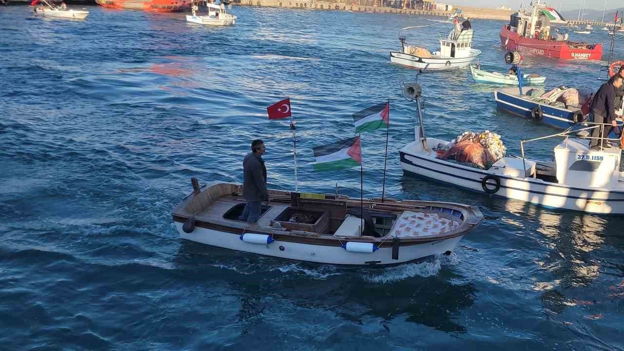 Kastamonu’nun İnebolu ilçesinde balıkçılar, Gazze’ye insani yardım ulaştırmak için yola çıkan Küresel Sumud Filosuna destek amacıyla tekneleriyle Karadeniz’e açıldı. Türk ve Filistin bayraklarıyla donatılan teknelerle denize açılan balıkçılar, İsrail’in filoya yönelik müdahalesine tepki gösterdi. İnebolu Limanı’nda düzenlenen programda bir araya gelen çok sayıda vatandaş ve balıkçı, Filistin halkına destek mesajı verdi. Program kapsamında, Filistin’de hayatını kaybedenler için Kur’an-ı Kerim okunarak dualar edildi. Katılımcılar, ellerinde bayraklarla "Gazze’ye özgürlük" çağrısı yaptı.