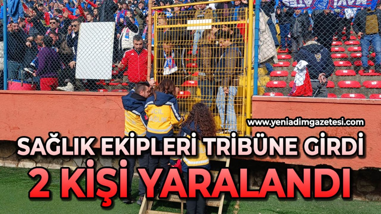 Zonguldakspor ile Karabük İdman Yurdu takımları arasında oynanan maç büyük heyecana sahne oluyor. Tribünlerden düşen ve elini tel örgülere yırttıran 2 Karabükspor taraftarı yaralandı. Sağlık ekipleri yaralananların ilk tedavisini yaptı.