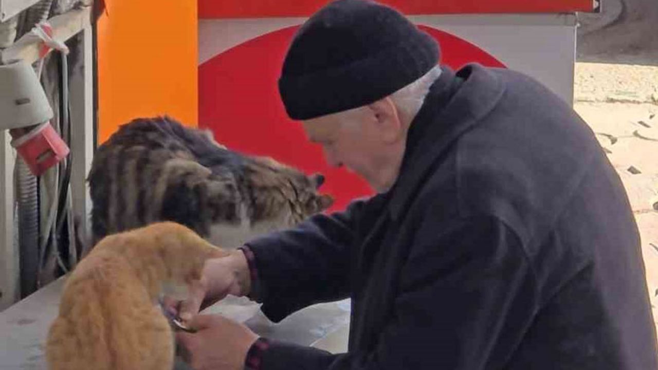 Sürekli sokak kedileri için mama aldığı öğrenilen yaşlı adamın sokak hayvanlarına gösterdiği şefkat ve duyarlılık, izleyenlere yüreklerini ısıttı.