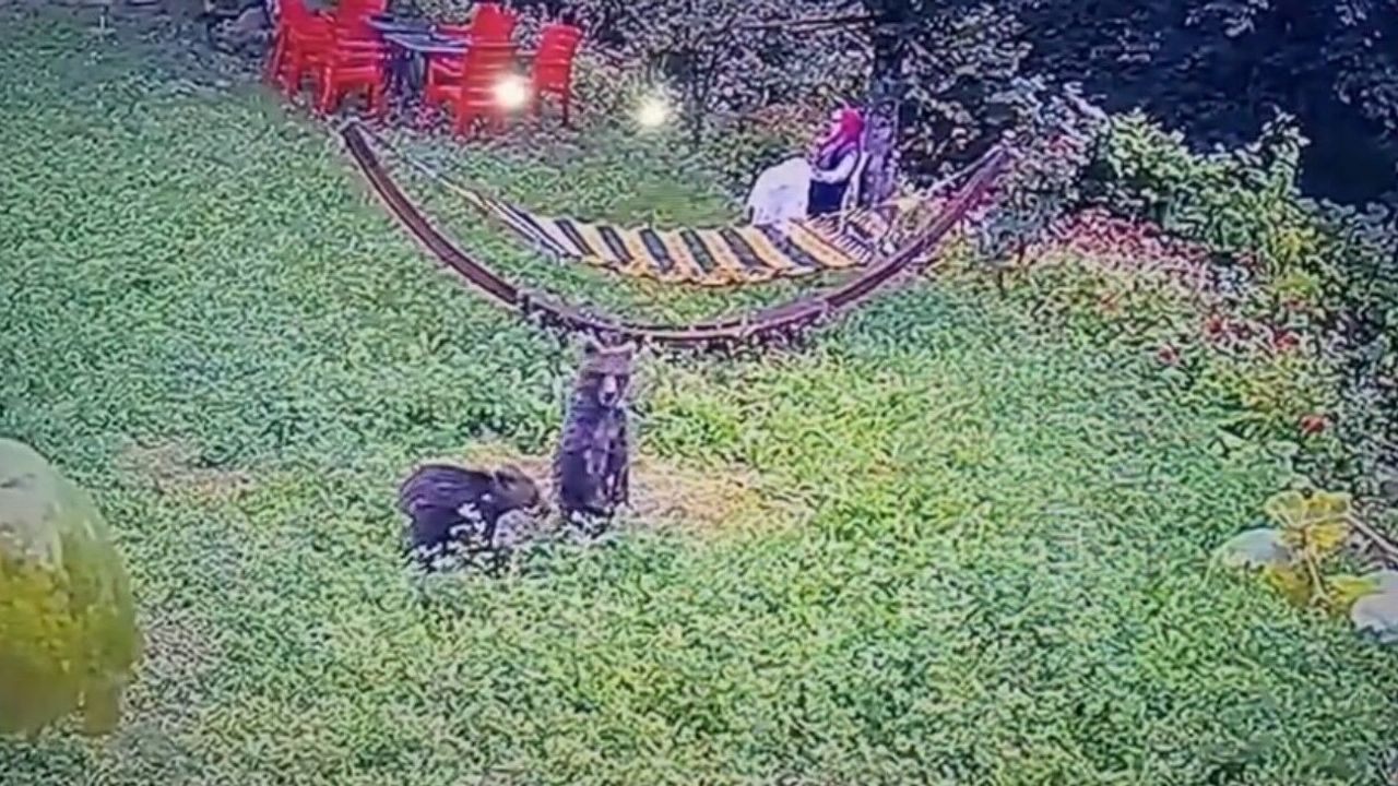 Bahçede bir süre dolaşan ayılar, çevreyi koklayarak yiyecek aradı. O anlar ise evin güvenlik kamerasına yansıdı.