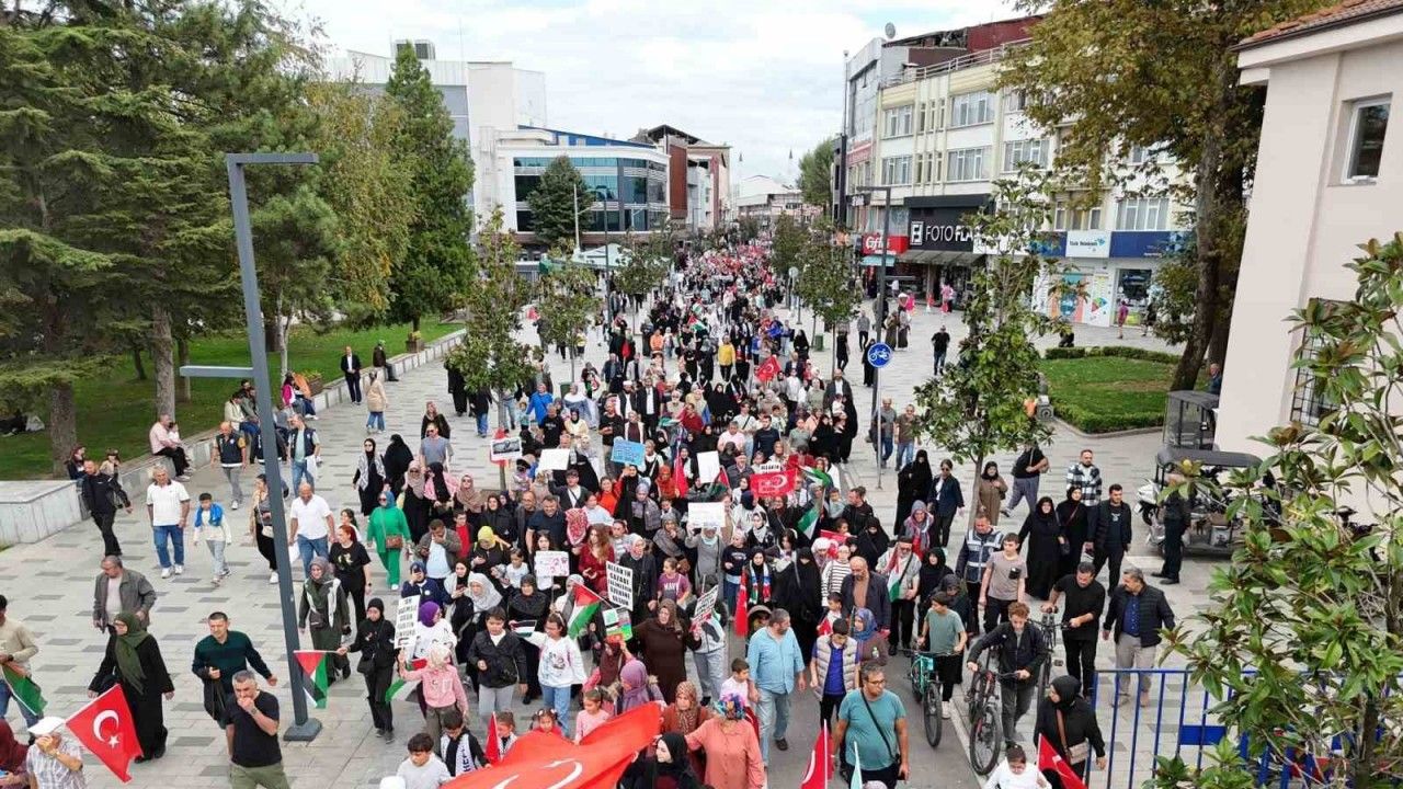 Düzce’de sivil toplum kuruluşlarının önderliğinde Filistin’e destek buluşması gerçekleştirildi. Kamu kurumlarının da destek verdiği buluşmaya yüzlerce kişi katılım sağladı. Cedidiye Meydanı’nda gerçekleştirilen büyük Filistin mitinginde İsrail’in hain saldırıları protesto edildi. Meydandaki mitingin ardından kalabalık grup İstanbul Caddesi üzerinden Anıtpark’a kadar yürüyerek sloganlar attı. İşletme çalışanları da yürüyüşe alkışlarla destek verdi.