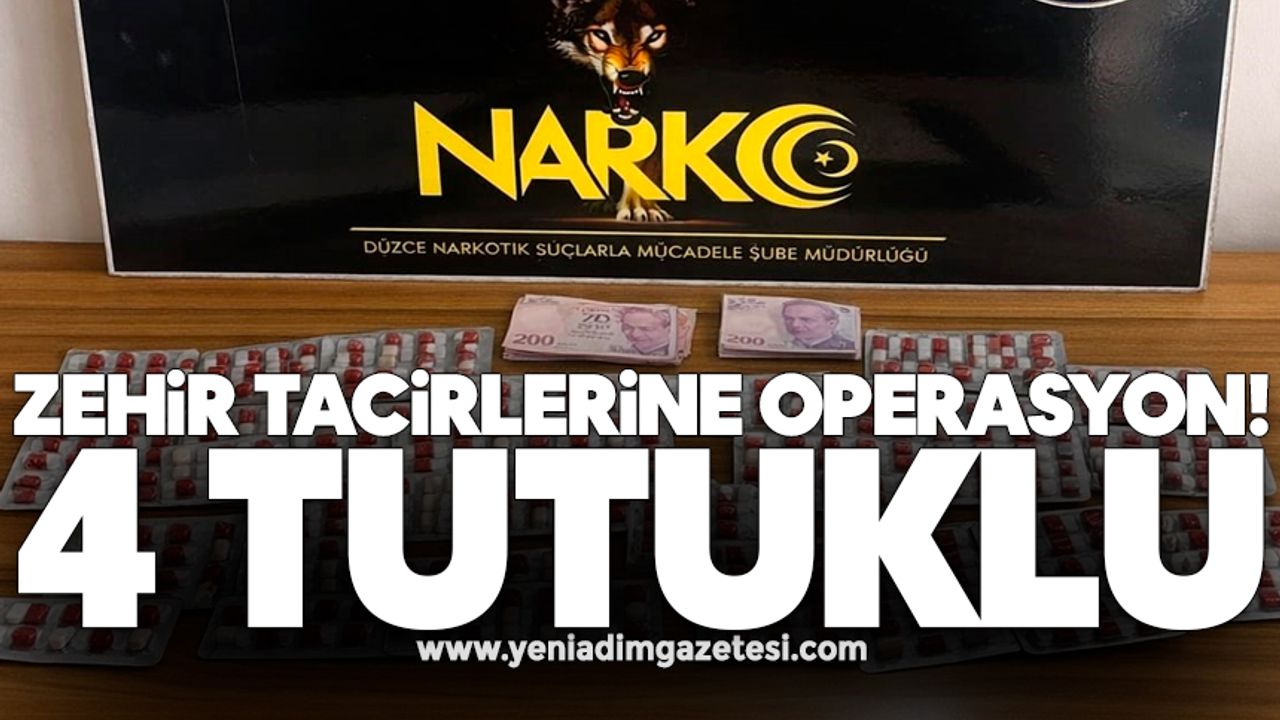 Düzce Cumhuriyet Başsavcılığının koordinesinde Narkotik Suçlarla Mücadele Şube Müdürlüğü ve Asayiş Şube Müdürlüğünce Burhaniye Mahallesi'nde 4 şahsa yönelik operasyon düzenlendi. Düzenlenen operasyonda; iki parça halinde 6 gram sentetik kannabinoid ham maddesi (600 gram sentetik kannabinoid elde edilebilecek ham madde), bin 566 adet sentetik ecza, 1 gram kokain maddesi, iki parça halinde 65 gram sentetik kannabinoid maddeleri ele geçirildi.