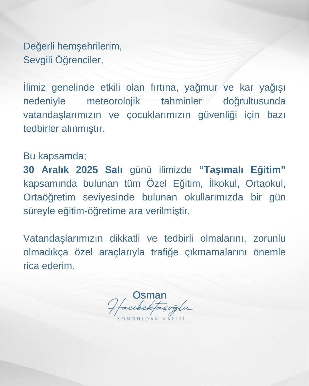 "Değerli hemşehrilerim, Sevgili Öğrenciler... İlimiz genelinde etkili olan fırtına, yağmur ve kar yağışı nedeniyle meteorolojik tahminler doğrultusunda vatandaşlarımızın ve çocuklarımızın güvenliği için bazı tedbirler alınmıştır.